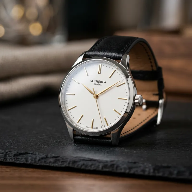 Professional macro photography of a luxury silver watch with a black leather strap, minimalist white dial, gold hands. Soft bokeh background, elegant lighting, high-end catalog style.