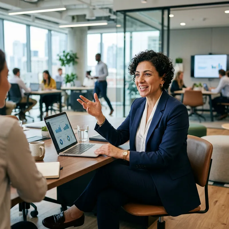 A professional woman mid-conversation amongst a backdrop of a modern office setting. She's a middle-eastern female, wearing a sharp, tailored business suit in a navy blue hue, paired with smart loafers. She has well-maintained, short, naturally curled hair. She has one hand resting on a laptop, the other animated in gesture, as if making an important point during a meaningful business discussion.