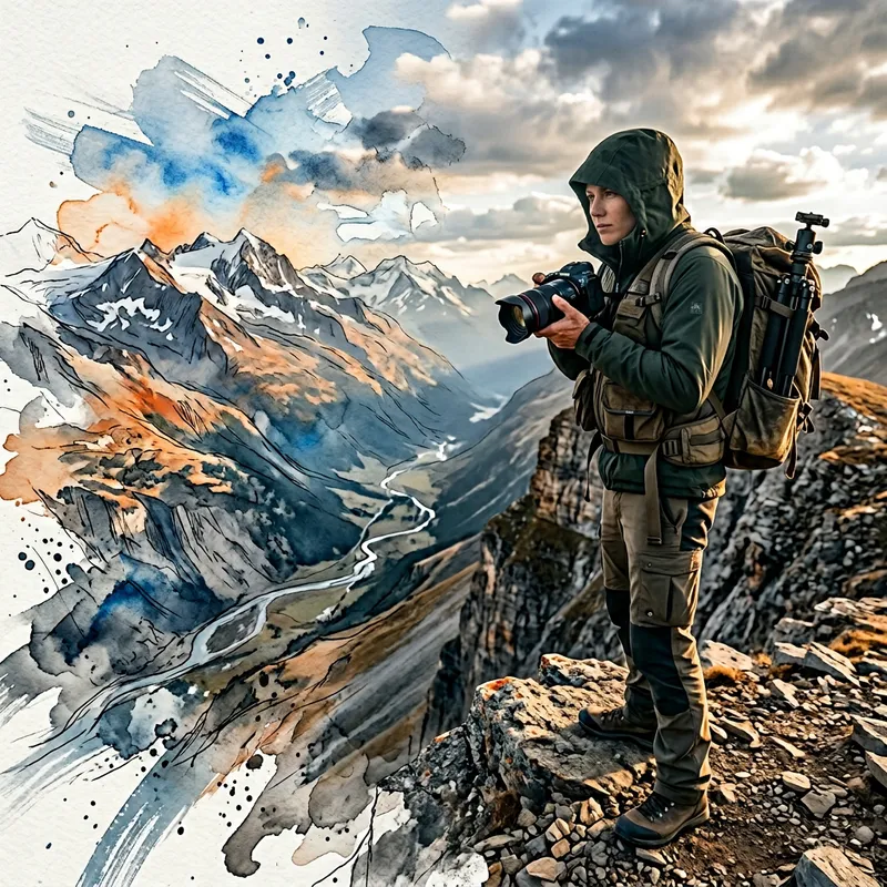 A detailed depiction of a person of unspecified gender and ethnicity, grasping a camera. They are standing at the precipice of a lofty mountain cliff. Their clothing and gear suggest a professional photographer, an explorer capturing the majesty of nature. To amplify the dramatic presentation, there's a distinctive transition effect applied to the scene, manifesting a unique blend of reality and artistic representation.