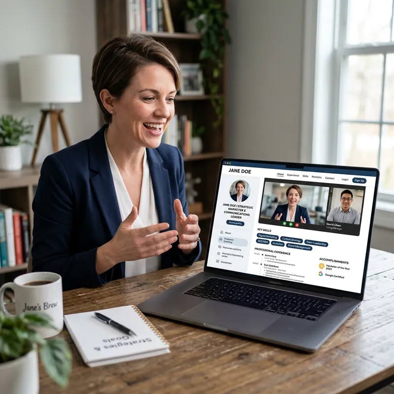 A dynamic digital representation of a professional individual showcasing their skills and expertise to impress potential employers. This image should depict a professional portfolio on a sleek and modern website, showcasing an organized layout with sections for skills, experiences, and achievements. An avatar of the individual, a Caucasian woman with short brown hair, is placed on the website. She is visible through a video chat interface as if she is in a professional discussion, indicating her strong online presence.