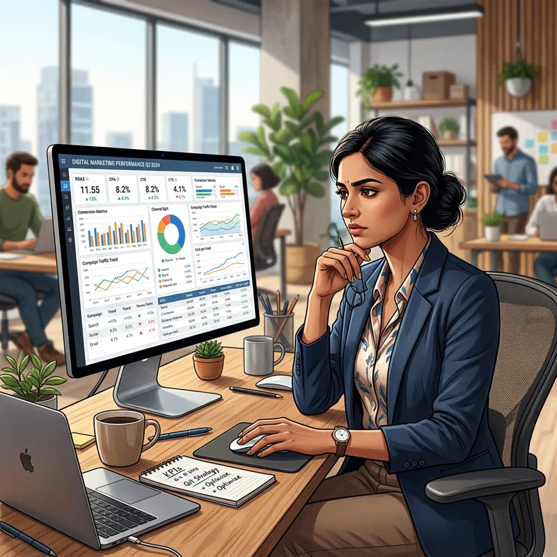 Detailed illustration of a South Asian woman in professional attire, presumably a digital marketer, sitting in a modern office, fully focused on her computer. She is carefully analyzing intricate marketing metrics displayed on her screen, filled with numerous tables, charts, and graphs, symbolizing the key performance indicators of a digital marketing campaign. The lighting in the room is softly illuminating her focused facial expressions indicating her astute analytical skills.