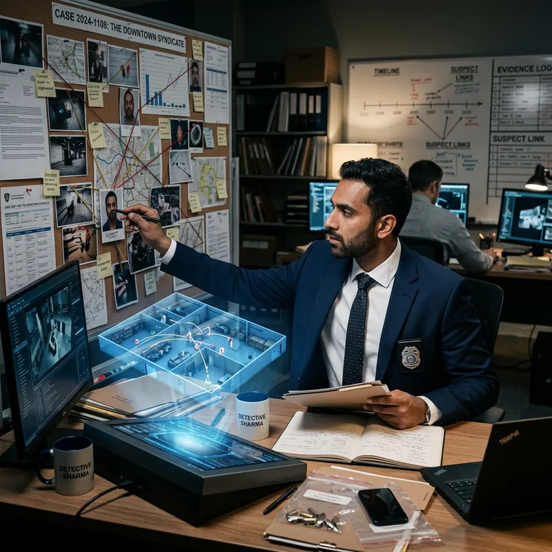 A diligently trained and professional investigator officer in action. The officer, of South Asian descent, is deeply immersed in a complex case, surrounded by sheets of detailed evidence charts, cryptic clues, holographic 3D models of the crime scene, and a sophisticated computer setup. His dark brown eyes are filled with determination and resilience. He wears a crisp navy blue suit with a silver badge representing his affiliation. His tie, with subtle geometric patterns, is neatly tied showing his methodological approach to his work. The room is dimly lit, creating an ideal environment for the officer to concentrate.