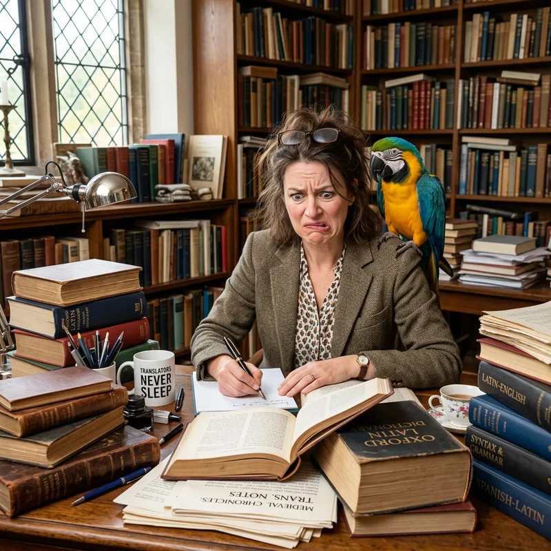Create an image of a professionally dressed translator at a large wooden desk piled with dictionaries and manuscripts, busily translating a text with a comical expression on their face. Humor is added to the scene through a colorful parrot perched on the translator's shoulder, apparently mimicking the translator's movements and expressions.