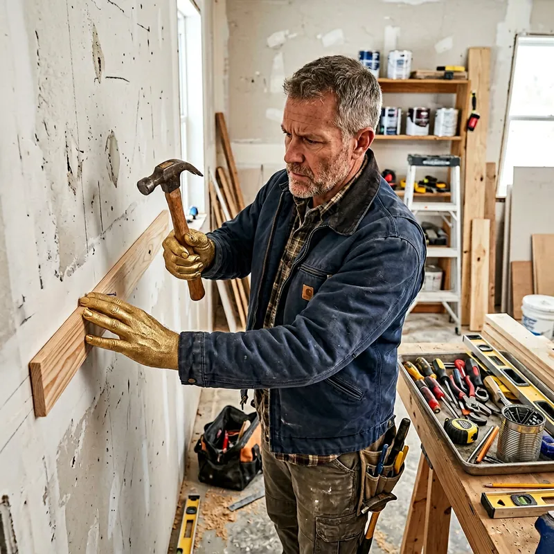 A Caucasian man with gold-colored hands is repairing a wall. He is wearing worker's clothing with protective gloves, and holds a hammer in one hand while fixing a piece of wood on the wall. His look is focused and determined, showing his professional skills. Behind him, there's a tray with all necessary instruments: screwdrivers, pliers, nails. The scene is brightly lit, showcasing all the details of the ongoing repair.