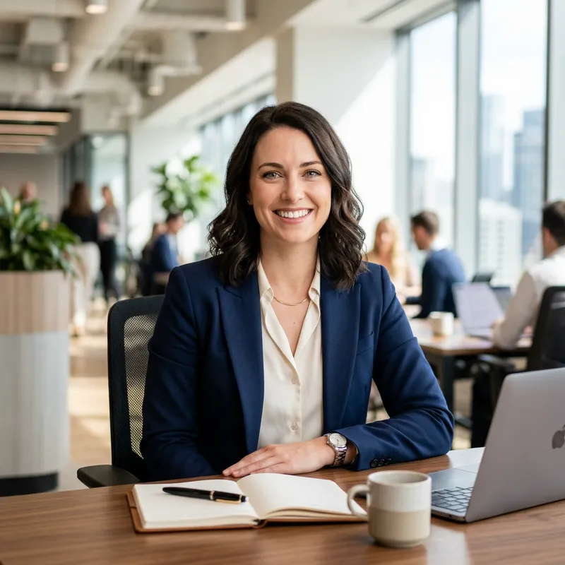 professional woman in a tailored blazer, seated at a sleek modern desk, styled in bright, high-key lighting with soft shadows, confident smile and open posture, captured with a shallow depth of field, canon eos r5, 50mm lens, corporate headshot, contemporary lifestyle