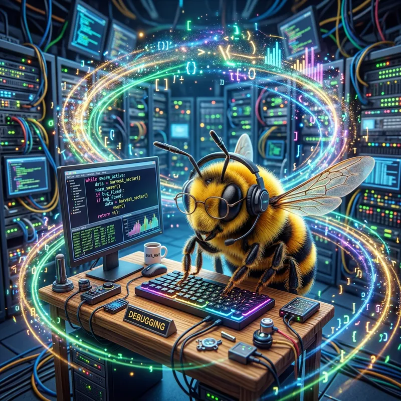 A bee designed as a programmer amidst an array of computers. It's equipped with petite spectacles, tiny headphones, and a miniature keyboard under its front legs. In front of it, there is a desk with a computer. Unusual, fantastic effects envelop the scene, adding an extra touch of vibrancy and color.