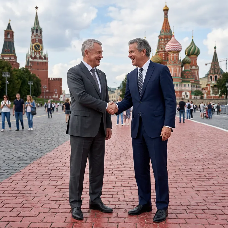 An image of a prominent Russian politician, wearing a classic grey suit, and a noted American media figure, dressed in a classic blue suit. They are standing in an iconic public square with red pavements, possibly in Moscow, joyfully shaking hands. They are looking at each other, smiles wide on their faces. The art style is realism, hyperrealism, and photorealism, aiming for a professional photo feel. The image is aesthetically pleasing, beautifully and realistically rendered, with an emphasis on high resolution and detailed representation.