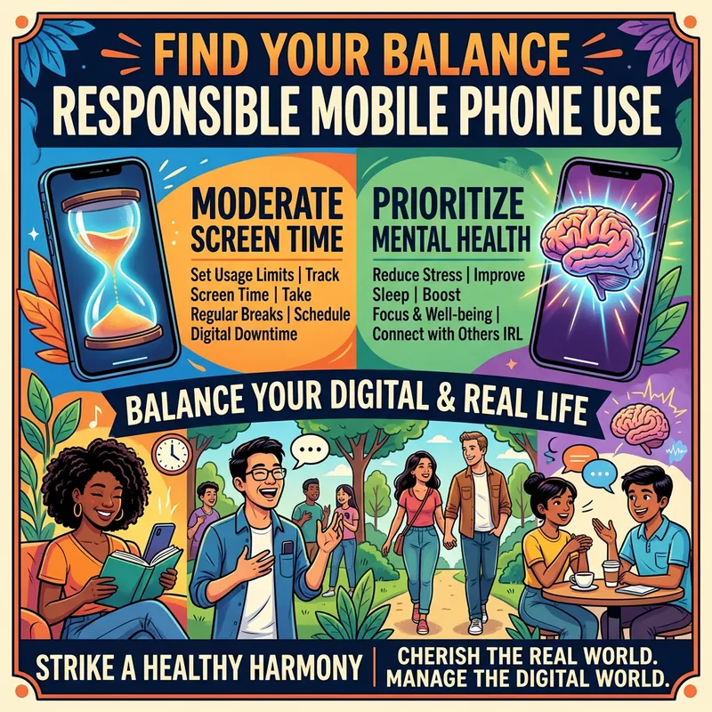 A poster promoting responsible use of mobile phones. The poster contains vibrant colors and bold text highlighting the importance of moderating screen time and considering the impact on mental health. It includes pictorial representations of a mobile phone with an hourglass, symbolizing time management and a brain, symbolizing mental health. A diverse range of people of different genders and descents are seen responsibly using their phones, showing balance between their digital and real-life interactions.