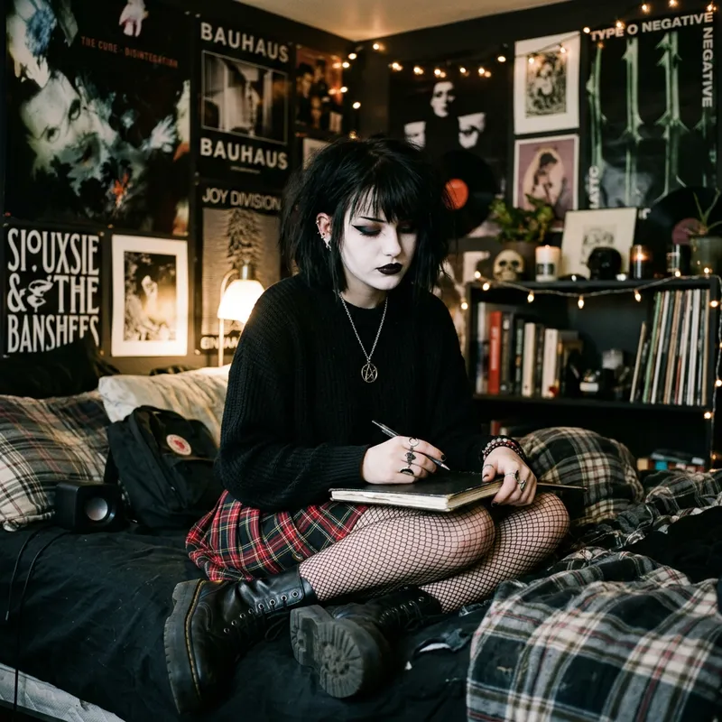 A 19-year-old college freshman girl with a unique goth aesthetic. She has pale white foundation, heavy black eyeliner, and dark lipstick. Her expression is shy and introspective, reflecting social anxiety. She wears a black oversized sweater, plaid skirt, fishnet stockings, and chunky boots. Her dark hair is styled in a messy bob with bangs partially covering her eyes. The background is a dimly lit college dorm room with gothic posters and soft lighting.