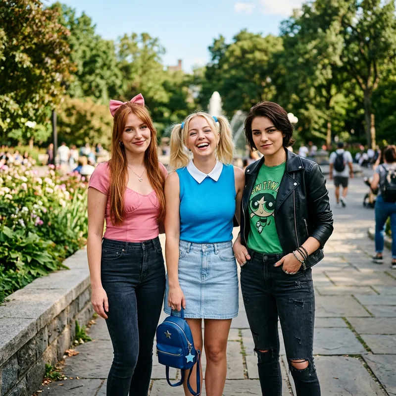 Three beautiful young women standing together, inspired by Blossom, Bubbles, and Buttercup from The Powerpuff Girls.