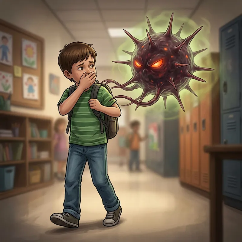 A vicious-looking virus attempting to attack a young boy