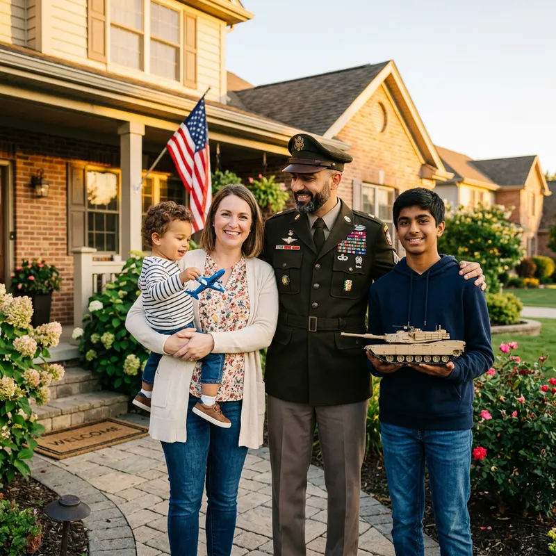 Visualize a Middle-Eastern male military veteran, wearing his decorated uniform adorned with service medals, standing tall and proud. Beside him is his supportive family, consisting of his loving Caucasian wife warmly holding their small toddler, who is busy playing with a toy airplane, and their teenage South Asian adopted son, who is excitedly holding a model of a military tank. In the background, you see a cozy home, bathed in golden sun, signifying the warm and secure environment they've built together.