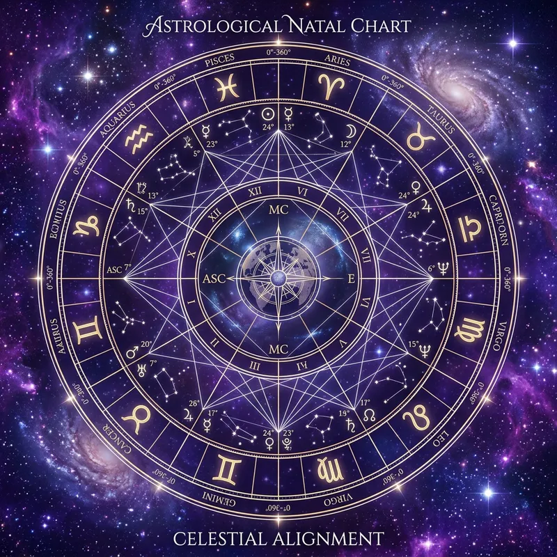 Visualize an image with a deep purple and blue galaxy-esque background, scattered with small sparkling stars. In the middle, overlay an intricate and detailed astrological chart, filled with symbols of zodiac signs and cosmic elements, all harmoniously connected by fine white lines to indicate alignment and celestial correlations.