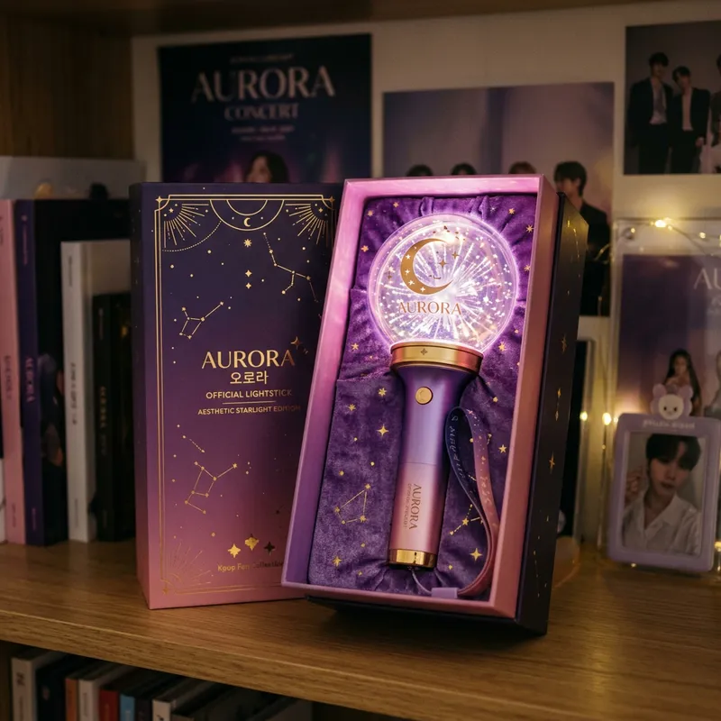 A purple and pink Kpop lightstick, emitting a soft, twinkling glow like distant stars, rests comfortably within an elegant, neatly designed box. The box, matching the lightstick in color scheme, creates a harmonious blend of aesthetic appeal. The entire setup radiates an essence of Kpop culture and fan dedication.