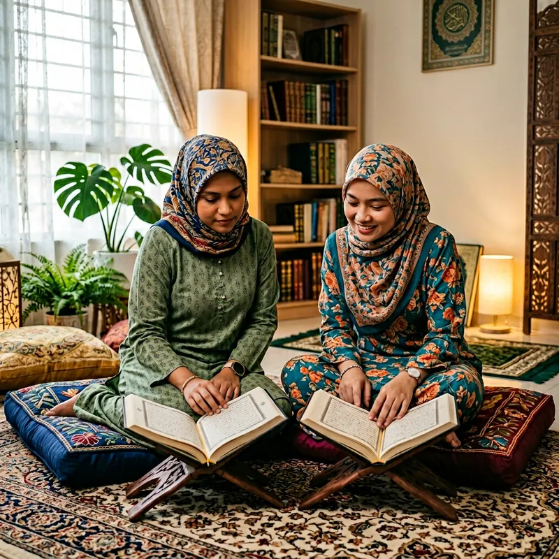 A South Asian descent woman named Putri and a South East Asian descent woman named Wani sit together in a peaceful environment, absorbed in the activity of Tadarus Alquran, a disciplined practice of reading and reflecting on the Holy Quran together. The women are dressed in modest, colorful attire suitable for the activity, with headscarves that denote their respect for the religious practice. They are seated on beautiful and comfortable floor cushions, with the Quran resting in front of them on ornate wooden stands. The room around them is softly lit, creating an atmosphere of calm and focus.
