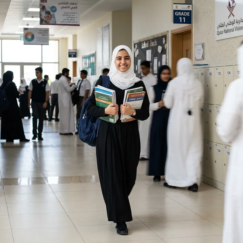 A high school student from Qatar. The image depicts a young Qatari female in her high school uniform, which consists of a long black dress and a white hijab. She is holding textbooks in her arm while walking in a school hallway. The picture is quite detailed, with a focus on her warm and inviting smile.
