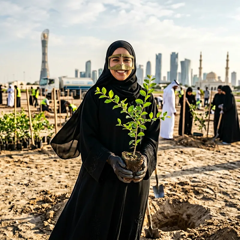 Portrait of a Qatari woman, who is consciously protecting the environment. In the photo, she holds a young deciduous tree ready to be planted, symbolizing her commitment to the green cause. She is wearing the traditional Qatari abaya and her countenance reflects determination and love for nature.