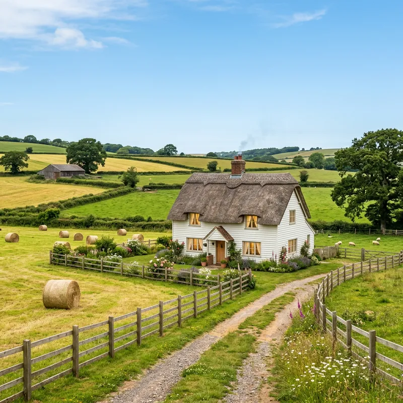 A peaceful, picturesque farmland sitting under a clear blue sky. The landscape is a patchwork of lush green fields, dotted with bales of hay, and surrounded by a neat wooden fence. In the heart of this rural scene stands a small, humble house with a thatched roof and white clapboard siding, emitting an aura of simple living. A meandering little path leads to the front wooden door, and the faint glow of warm light can be seen shining through the curtained windows, symbolizing the warmth and comfort found within this quintessential country abode.