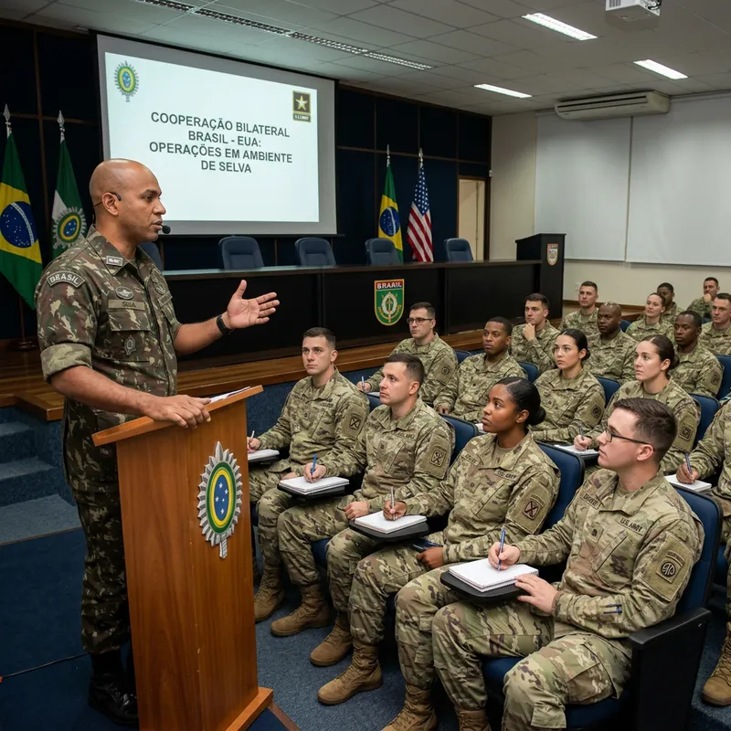 I want a soldier with brown skin and bald head, wearing a Brazilian army uniform, giving a lecture to 20 other soldiers of the American army.