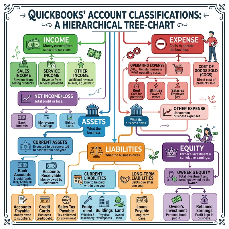 An illustrated chart detailing the structure of QuickBooks' account classifications. This would include a hierarchical organization of accounts, categories, and subcategories, visualized in a tree-chart format. The chart shows various types of accounts such as Income, Expense, Assets, Liabilities and Equity with their respective sub-categories. Each node on the chart is distinguished with individual colors and comes with explanatory text. This layout is placed against a white background for clarity.