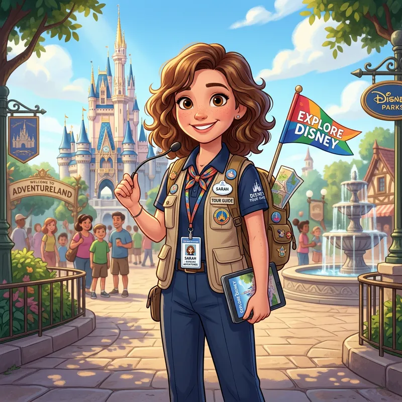 I want to generate an animated girl from the tourism career, Disney style, with a little wavy brown hair.