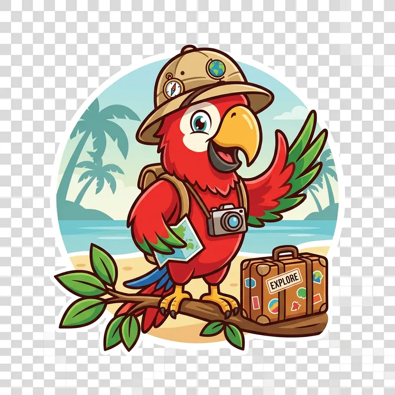 I want you to create a red parrot with a tourism hat. This will be in a cartoon design, and will be used as a mascot for a tourism website. Give me the vector files of the image so I can modify it.
