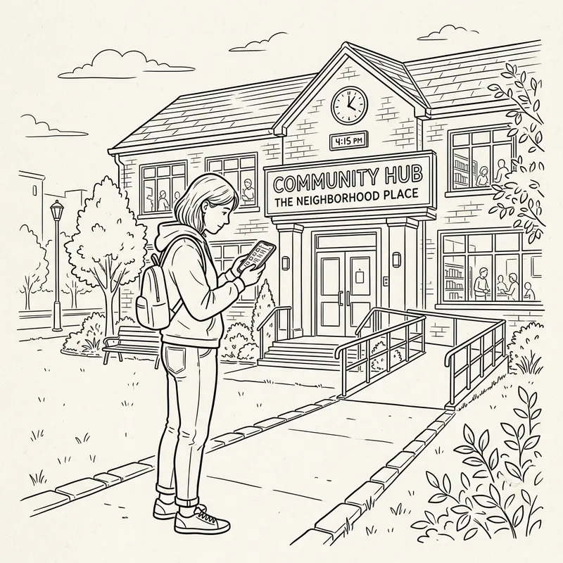 I want a linear drawing of a person looking at a mobile in front of a community building.