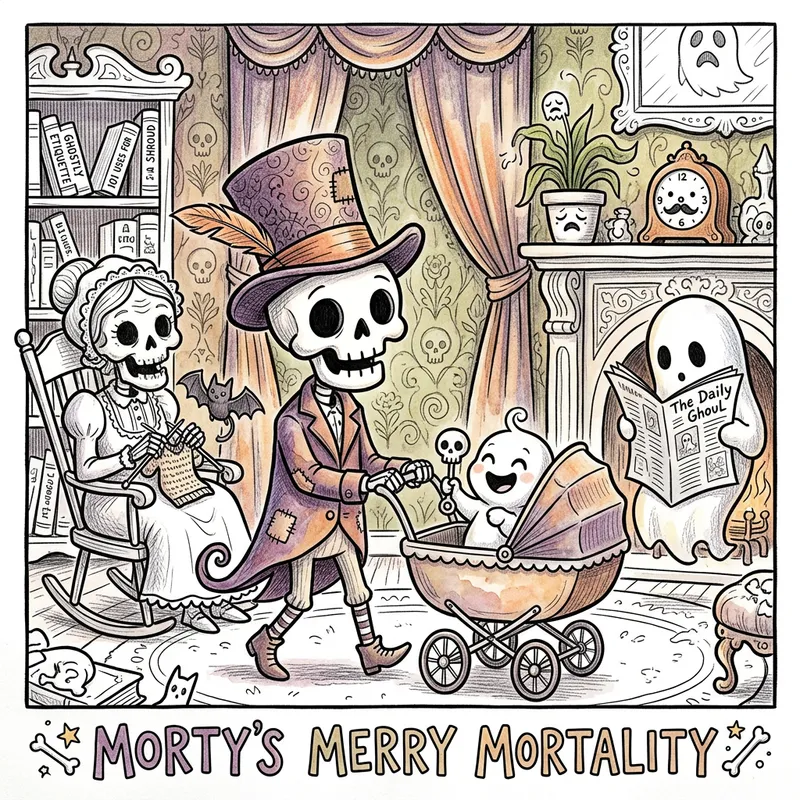 A playful and quirky coloring book page that presents the theme of mortality with a touch of humor. The page features cartoonish characters interacting in a vibrant and lively environment, full of bold colors and interesting backgrounds. The art style infuses three essential traits - whimsicality, a dash of spookiness, and an obvious fondness for exaggerations. Reference to the late Victorian era underlines the context, highlighting mixed media techniques including watercolor and colored pencil details. The overall feel is akin to the dark comedy genre.