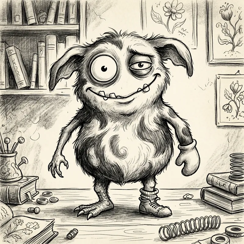 A quirky little creature comes to life in this picture. It's monochromatic, with only shades of black and white lending detail to its appearance. This eccentric monster has a collection of improbable features which add to the weirdness of its depiction. Imagine mismatched eyes, a lopsided smile, and a hunched posture. Despite its strange aspects, there's something endearing about this monster. Perhaps it's its oddly proportioned body or its mismatched appendages. This is an illustration meant to evoke amusement and a sense of the extraordinary.