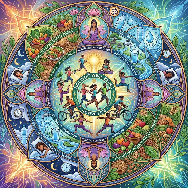 Create an image that utilizes radial balance conveying a harmonious and comprehensive attitude towards health and well-being. At the center, show a depiction of diverse people of different descents like Caucasian, Hispanic, Middle-Eastern, South Asian, and Black, both male and female, engaging in various forms of exercise. Surround these individuals with designs that symbolize other aspects of wellness, such as plant-based foods, meditation symbols, hydration symbols, and sleep symbols. The image's elements should all radiate outward from the central point of exercise, mirroring each other in an evenly distributed pattern.