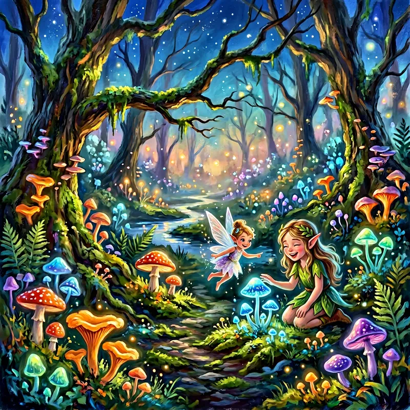 depict a mystical forest brimming with radiant mushrooms, staying true to an Impressionist inspiration. Illuminate the scene with delicate, dreamy lighting, charming characters in whimsical poses, and use luminescent airbrush techniques for accentuation. Imagery should display a fantasy-inspired theme throughout.