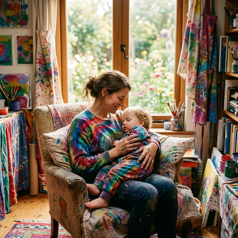 A mother sitting by a window with a warm, translucent light filtering in. She is cradling her child in her arms, both donned in clothes painted with colors of the rainbow. The hues swirl, mix and dance quietly on their clothing, mimicking the chaotic splashes of colors strewn all around them. The serene moment is further punctuated by the tender, loving gaze of the mother towards her child, providing a heartwarming sight amid a riot of colors.
