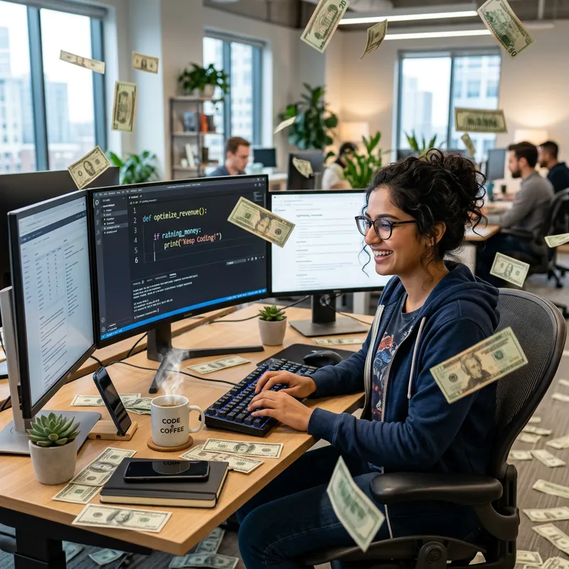 An image depicting a cheerful South Asian female programmer, engrossed in her work on multiple computer monitors. She sits in a well-lit contemporary office setting, donning a casual attire with a pair of stylish, nerdy glasses. Meanwhile, a surreal episode ensues as numerous green dollar bills start to rain gently all around her. However, she remains undistracted and continues to type swiftly on her keyboard, demonstrating her dedication towards her job. Her desk is neatly organized, housing a couple of high-tech gadgets and a steaming cup of coffee.