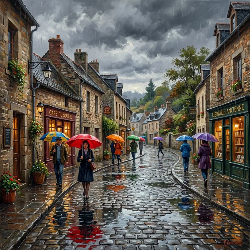 A serene landscape painting displaying a rainy afternoon. The cloudy sky is filled with heavy grey clouds ready to pour down. Drops of rain are starting to fall onto the cobblestone street, leaving wet spots. There are a few people around, each one holding colorful umbrellas that provide a stark contrast against the gloomy backdrop. Some are hurrying to find shelter, while others are calmly walking and enjoying the change in weather. Each puddle on the ground reflects the muted colors of the environment, adding a sense of depth and realism to the scene.