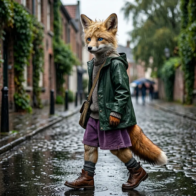 Visualize a scene where a fox boy is placed against a rainy backdrop. He has striking blue eyes, noticeable from a distance. His blonde hair is ruffled, imparting a playful vibe. In sync with his brawny traits, he dons a purple skirt. The image is a side-view or profile shot, capturing the essence of his unique, anthropomorphic features with a high degree of detail.