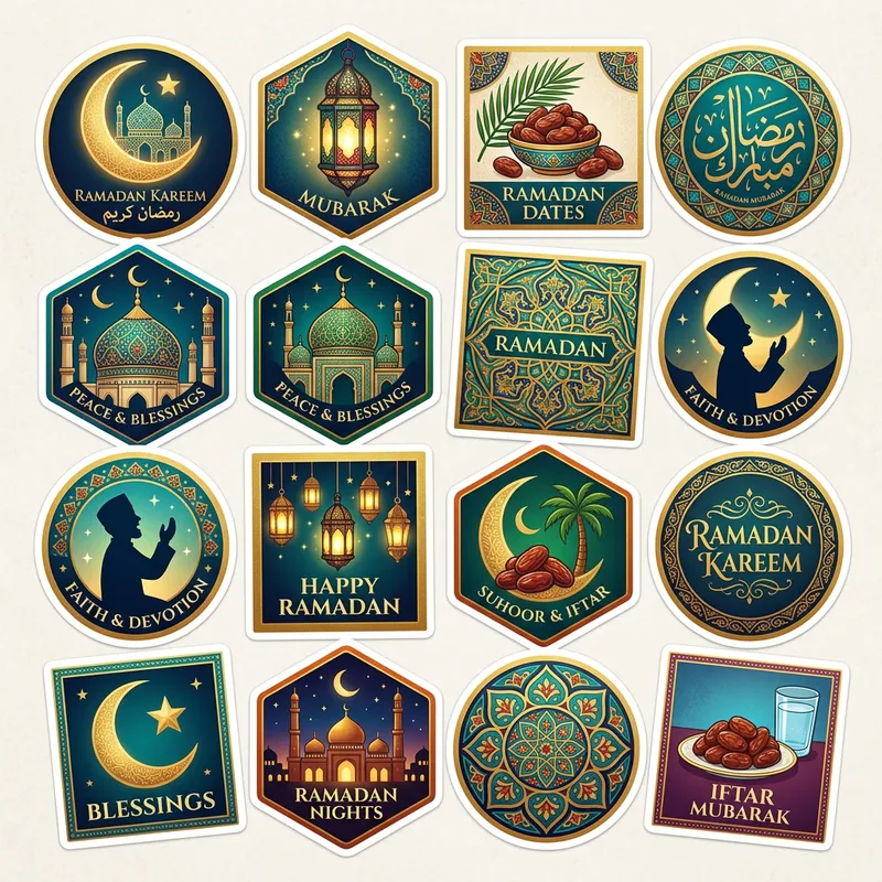 Create a set of festive stickers for the celebration of Ramadan. Include a variety of symbols commonly associated with this holy month such as the crescent moon, lanterns, dates fruit, Islamic geometric patterns, and Arabic calligraphy. Ensure a variety of vibrant colours are mingled with traditional golds and greens. Add a sense of joy and spirituality in the stickers. The stickers should be of different shapes like circle, square and hexagon. Also, balance the assortment to include both simple and intricately designed stickers.