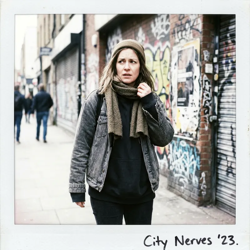 Create an overexposed and grainy street style polaroid image that exudes a raw aesthetic. The focal point of this photograph should be an anxious Caucasian woman, appearing restless and uneasy. She could be making small, erratic gestures and her body language can be interpreted as tense. Her clothing is layered and textured, demonstrating a street-inspired style. The environment complementing her may depict a bustling cityscape or a graffiti-adorned alleyway, for that raw, urban feel.