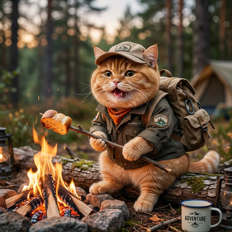 A small, chubby, ginger British cat in real-life settings. It's dressed in hiking attire with a backpack slung over its shoulder. On its head is a cap. It's sitting by a campfire, toasting a piece of bread on a stick and beaming widely. The context is aiming for realism, hyperrealism, and photorealism, professionally created, aesthetically pleasing, beautiful, realistic, with high resolution and detail.