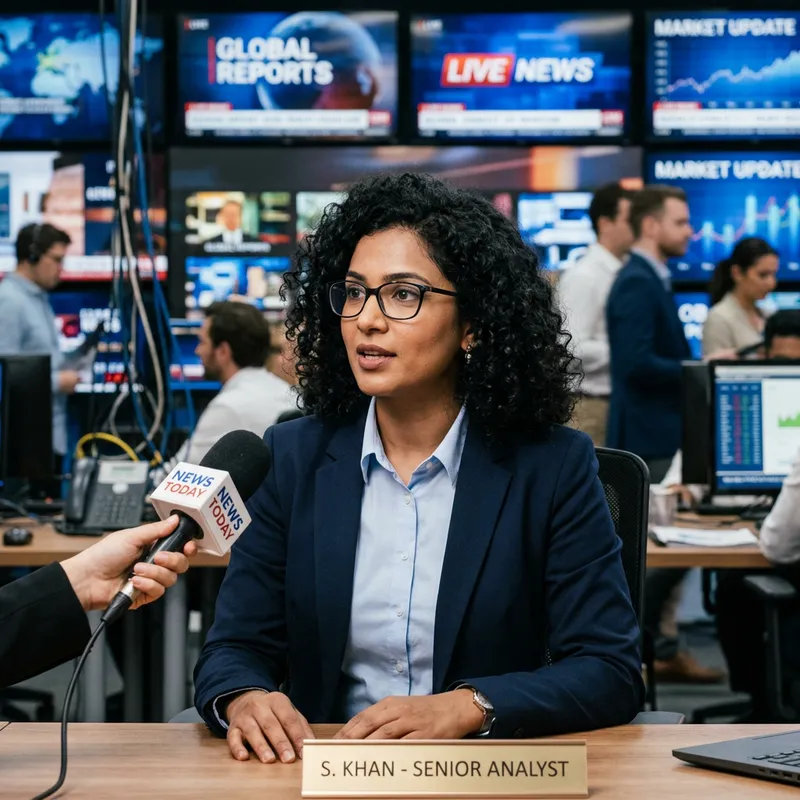 A real person being interviewed. This person is of South Asian descent and identifies as female. She is in her mid-thirties, with thick, curly black hair and she's wearing glasses. She has a thoughtful expression as she thoughtfully answers the interviewer's questions. She's dressed in a professional attire, a button-up shirt and blazer, with a microphone held close to her. The backdrop is a blurred image of a newsroom, with screens displaying various graphics and people hurriedly walking around, engrossed in their respective tasks.