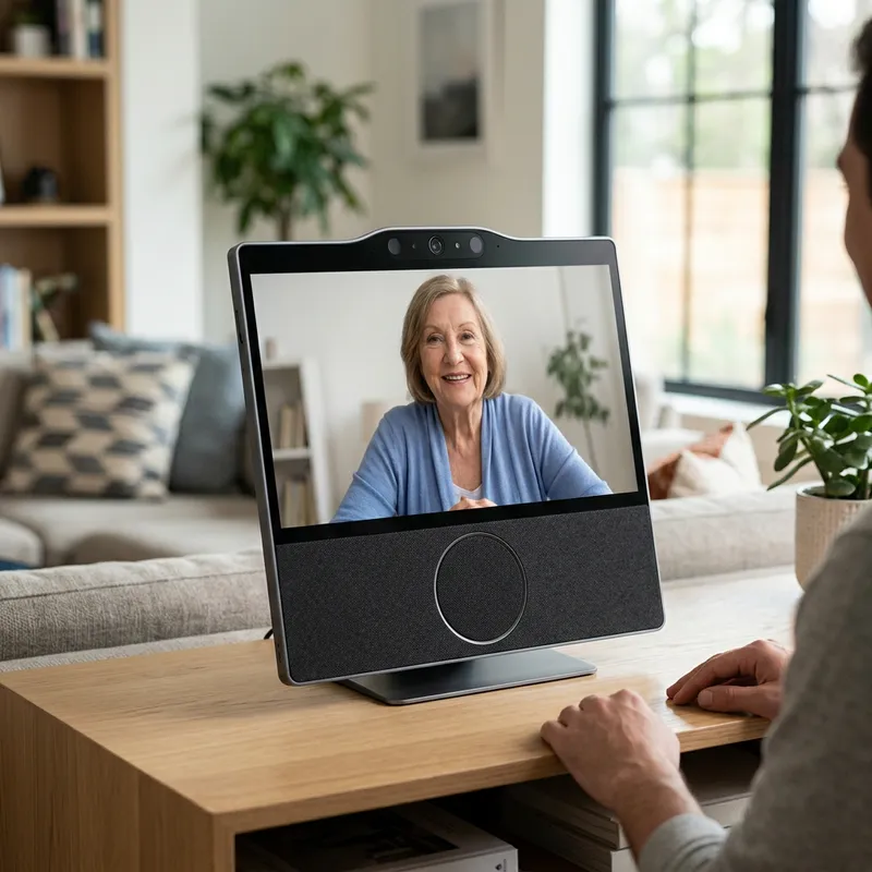Imagine a device designed for remote real-time communication. This device presents life-like visuals of the person you're communicating with, capturing every nuance of facial expressions and gestures. Picture it as a state-of-the-art system constructed with advanced technology, presenting high-definition video transmissions on a large, sleek screen. The embedded round speakers at the bottom deliver crystal-clear audio for an immersive audio-visual experience. At the top, a wide-angle camera lens captures the user with stunning precision. The body of the device is sleek and compact to fit comfortably in modern living spaces.