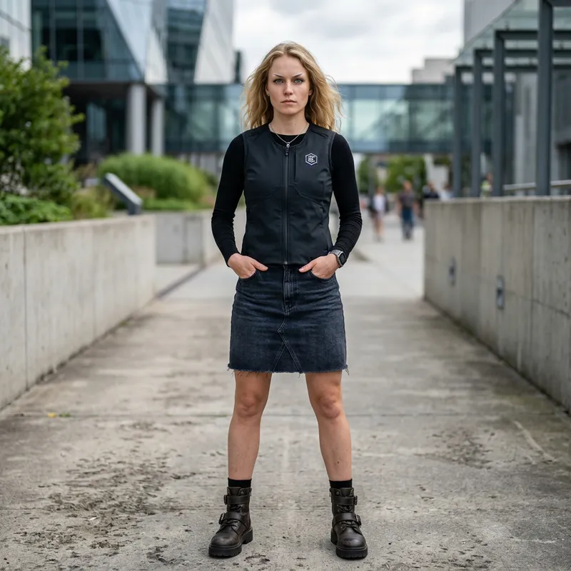 Create a realistic human woman with shoulder-length blonde hair, sporting a minimalist style. She is wearing a slim-fitting black vest and a denim skirt, with ample boots. Her faint eyebrows are sharply angled with the look of confidence. She has a pair of blue eyes that glisten with strength and bravery. A few subtle futuristic elements are incorporated into her look, like a small metallic emblem on her vest.