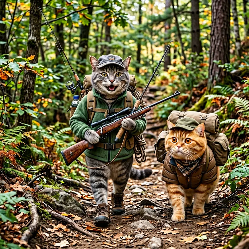 A real-life representation of a gray tomcat, dressed in a hiking outfit with a backpack on his shoulders and a fishing rod. He is wearing a cap and is walking through the forest with a radiant smile on his face, wielding a rifle. Standing close by is a chubby real-life British orange tabby cat, also dressed in a hiking outfit, with a backpack, and a cap on its head. He has enormous eyes. The scene is depicted in a highly detailed and aesthetically pleasing manner, leaning towards realism, hyperrealism, and photorealism, emulating the quality and precision of a professional photo.