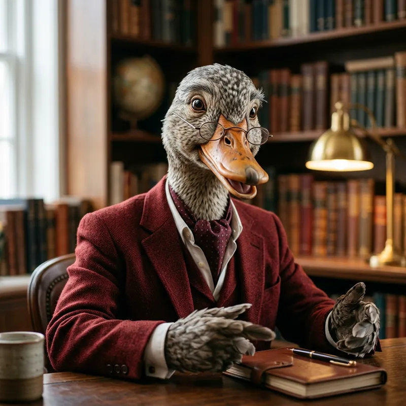 Create a portrait of a fictional anthropomorphic duck with distinguished, older features. He should be depicted in a mid-conversation, facing towards the camera in a real-life style. Visualize him in a striking red jacket and glasses, exhibiting a sparkle of wisdom behind his eyes.
