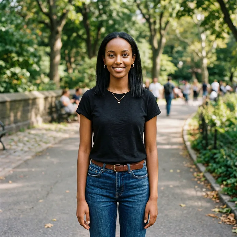 Realistic image of a slender girl with clear brown skin, short, straight black hair reaching her shoulders, and almond-shaped dark brown eyes. She's dressed in a black t-shirt and jeans.