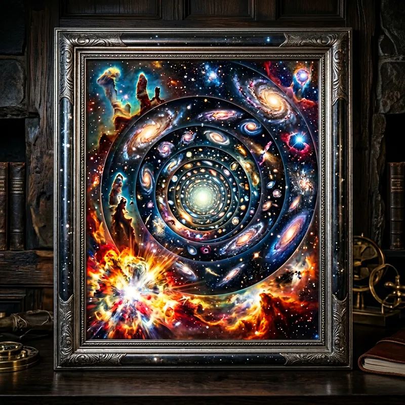 Create a visually detailed image of an infinity mirror, within which is reflected an evolutionary timeline of the cosmos. The view should start with the Big Bang - a spectrum of vibrant colors and chaos. It should then transition into stars and galaxies beginning to form, gradually displaying a variety of colors and shapes over time. The cosmos in this mirror should be beautifully chaotic, yet gradually become more structured with stellar evolution, culminating in concretized shapes of galaxies, nebulae, pulsars, and other celestial bodies, elegantly swirling and intertwining in an unending dance of cosmic creation and destruction. The mirror itself should appear as highly realistic, featuring hues of silver and metallic colors.