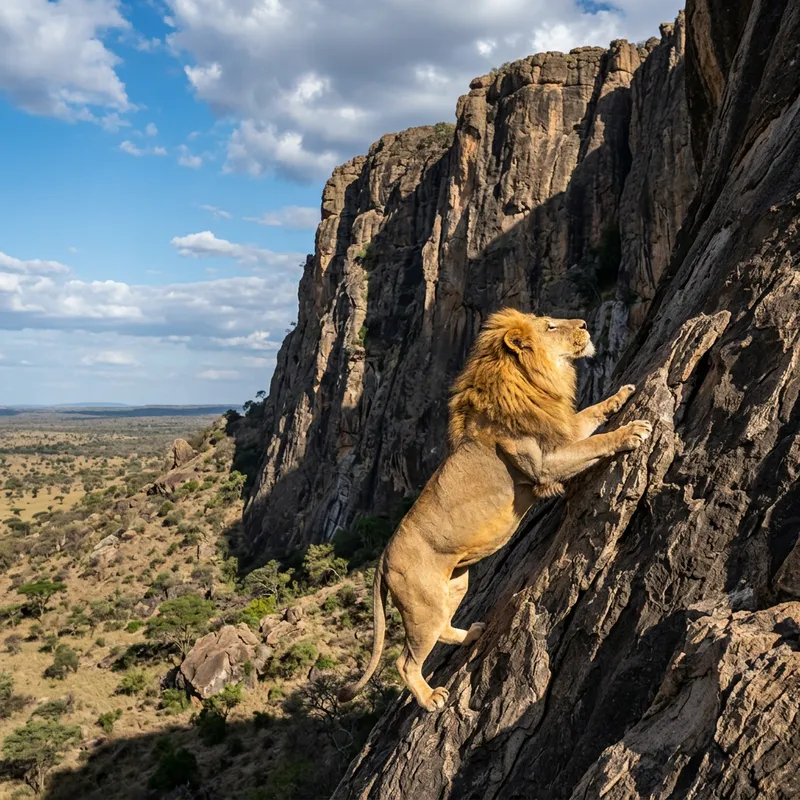 Depict a scene of a realistic, majestic lion with a golden mane meticulously climbing up a rough, rocky cliff. The cliff towers high into the sky and presents a formidable challenge, yet the lion moves with determination and strength. Sunlight sparkles on the lion's tawny coat adding depth and texture. The surrounding landscape is sparse, with few trees and shrubs, highlighting the solitary climb of the lion. Clouds lazily drift by in the azure sky above, and the shadows they cast upon the cliff face further emphasize the rugged terrain. The scene serves as a poignant metaphor for survival, echoing the resilience and courage inherent in nature’s creatures.