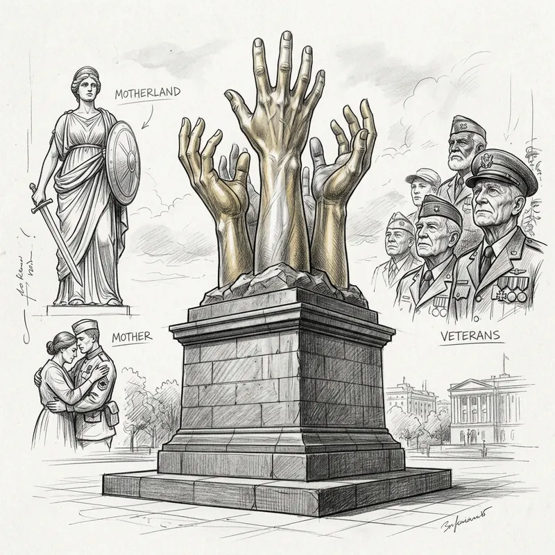 A sketch of a monument styled in realism, reflecting heroic strength and power. The monument consists of golden and silver tones with hands reaching towards the sky as a symbol of victory. The style portrays meticulous lines of man-made stonework. The image should also include black and white hand-drawn graphics of motherland, mother, and veterans.