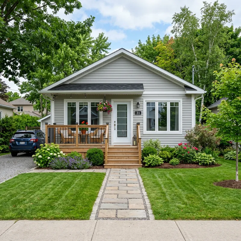 A hyper-realistic single-storey frame house, adorned with a welcoming balcony. The house features modern plastic windows installed, all nestled fittingly within a well-maintained residential site. Details are to include a lush green lawn, a neatly paved pathway leading to the house, and surrounding plants and trees adding to its homely ambiance.
