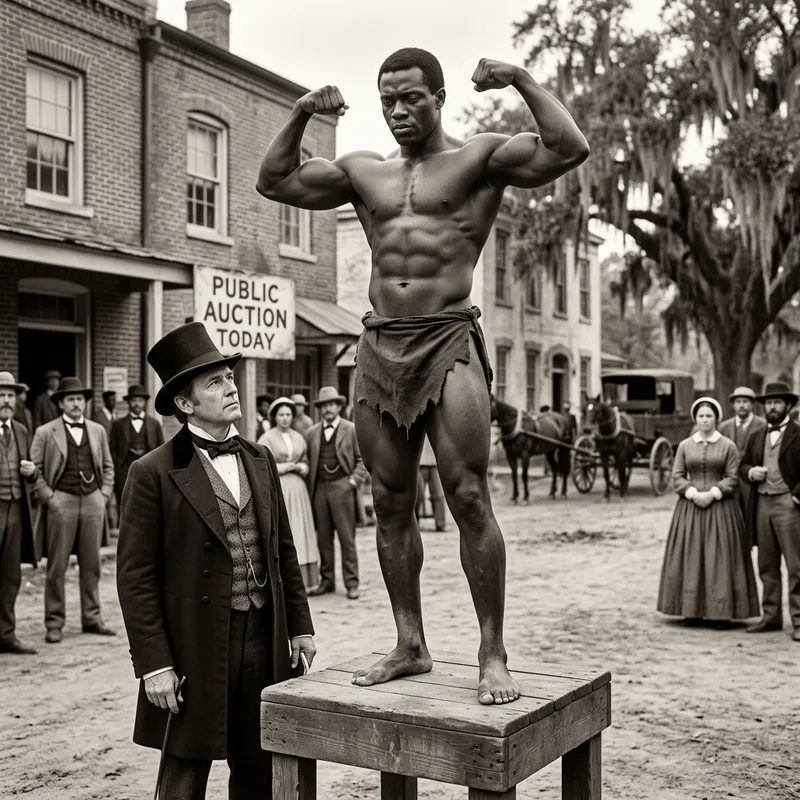 Realistic photo, handsome muscular bodybuilder African-American 30 years-old, is standing on an auction block to be sold into slavery, flexing biceps, slave, feet, soles, toes, heels, bare feet, slavery, labor, southern plantation, barefoot, shoeless, shirtless, ragged loincloth, year of 1860, while a well-dressed Caucasian white man is observing him, 4K.