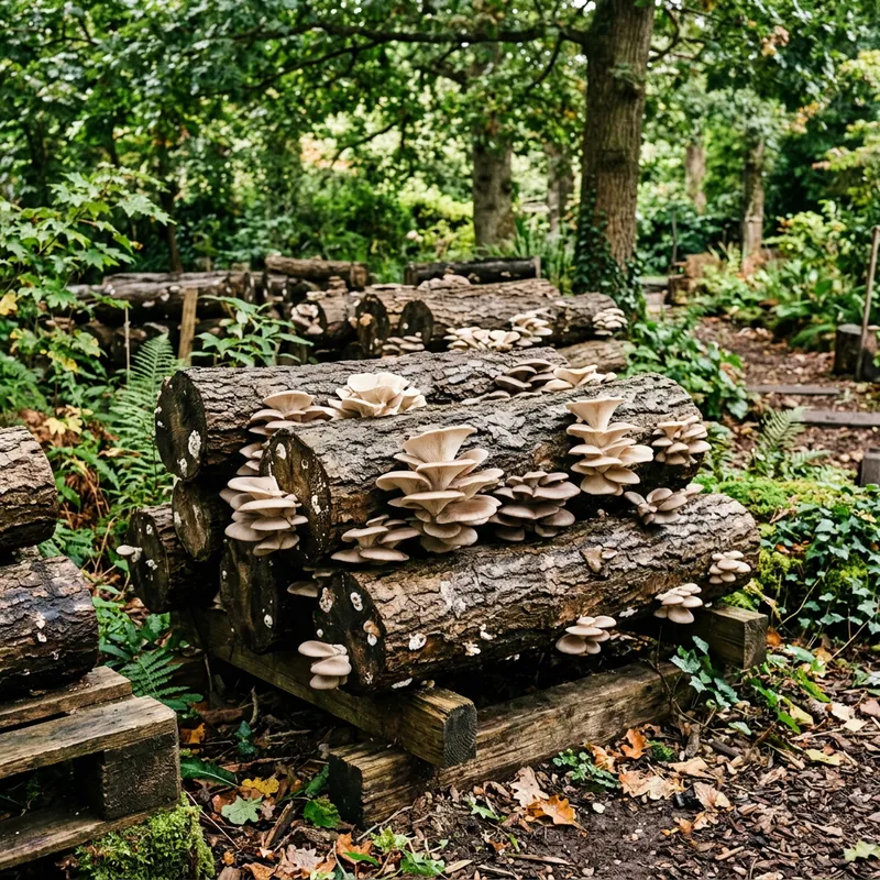 Realistic photo of mushroom cultivation on wooden logs, showing oyster mushrooms growing from oak logs stacked in a shaded garden area, detailed, natural lighting.